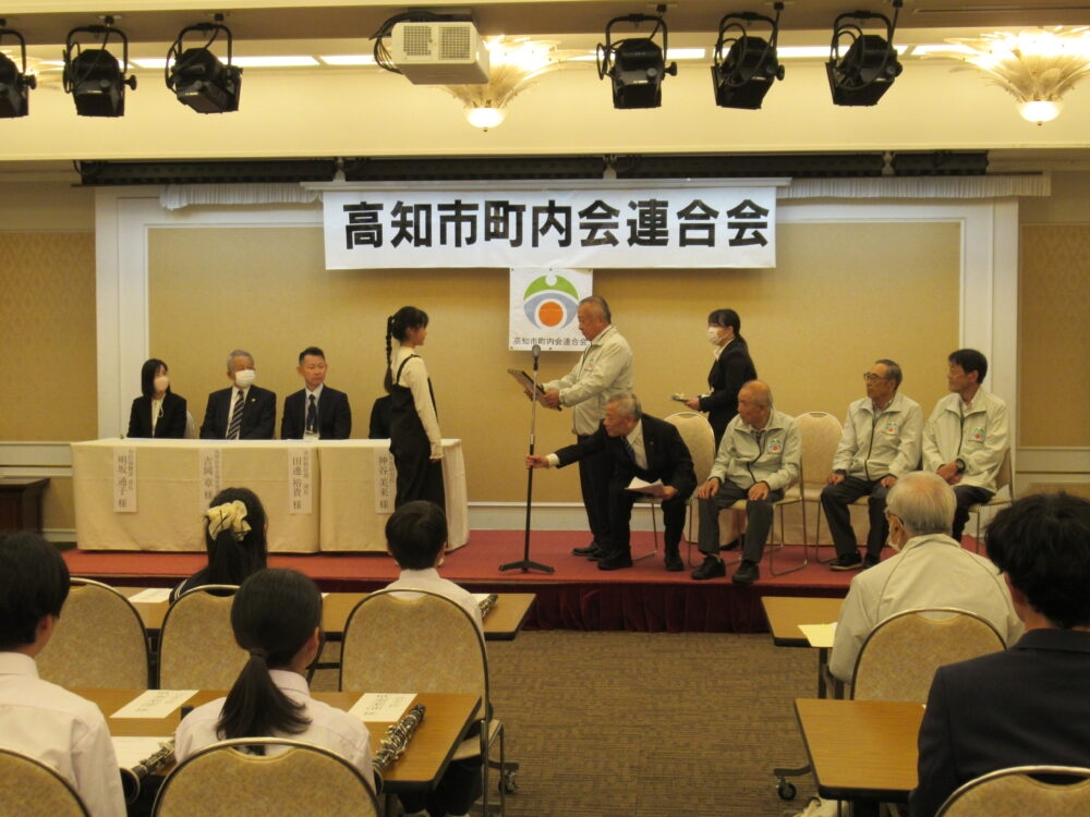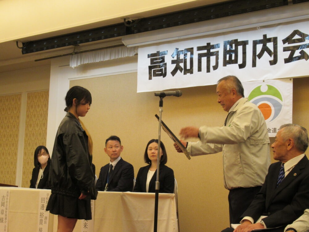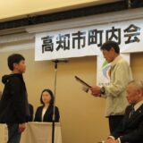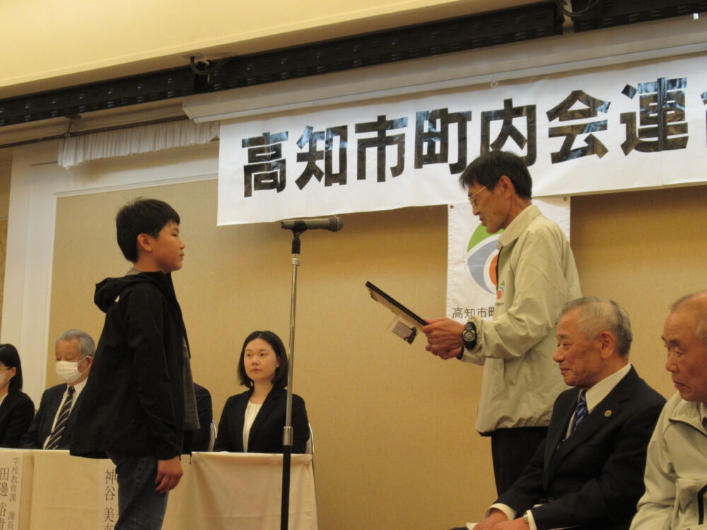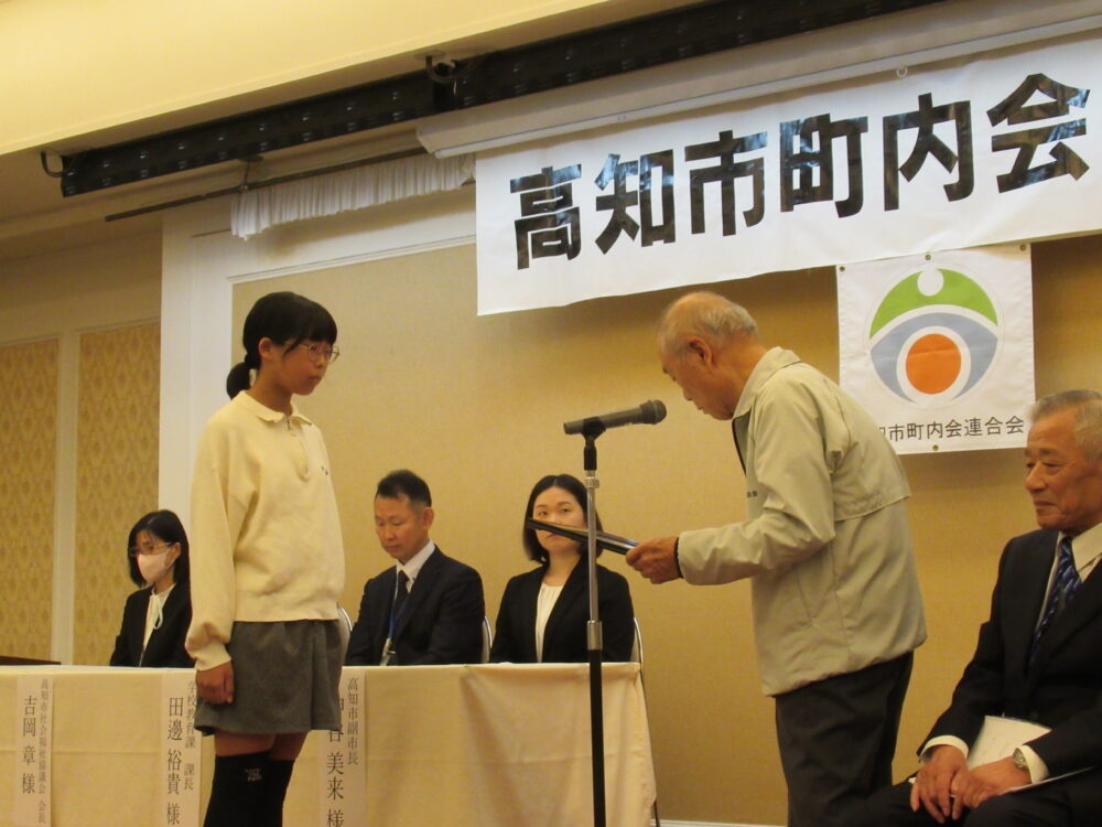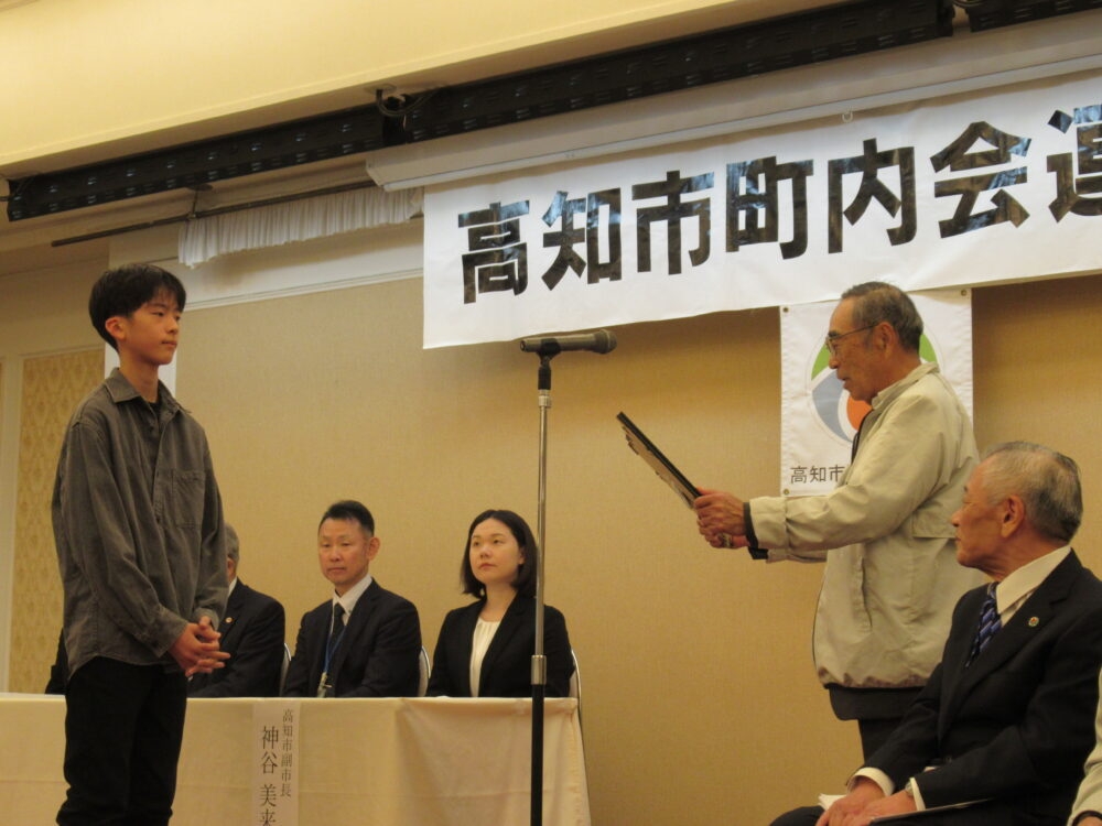 令和7年度 第3回「わたしのまち」コンクールを開催しました。今年度は作文⇒標語にリニューアルし、新しい視点から地域を発見することが出来ました。「標語コンクール」には高知市内10校585名の応募をいただき、その中から厳選なる選考の結果「最優秀賞1名」「優秀賞9名」のみなさんが受賞されました。おめでとうございます。表彰式は11月9日(日)高知会館にて行い、当日は最優秀賞含む9名のみなさんが少し緊張した面持ちでご来場され、神谷副市長ご臨席のもと、当連合会役員理事より賞状と記念品が授与されました。受賞作品については令和7年12月1日(月)~12月26日(金)まで高知市役所 本庁舎1階 北側 ファミリーマート横にて作品の展示をさせていただきますので、素晴らしい作品を是非ご覧ください。